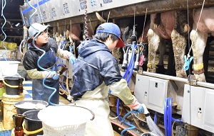 当社は4月1日に入社式をしますが、入社後3日間は香川県中小企業家同友会が実施する新入社員研修に参加し、「働く意味とは何か」等を学びます。その後は各部門に配属され、先輩社員から仕事の方法を教わります。いわゆるOJT(オン・ザ・ジョブ・トレーニング)ですね。当社の酪農部門には、朝搾乳、夕方搾乳、仔牛部門の大きく3つに分かれており、配属先は採用側が適性を見て決めていく場合がほとんどです。なお当社の酪農部門の規模は、乳用経産牛が300頭、仔牛が約60頭です。