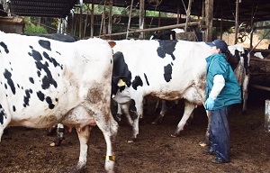 (左)牛を搾乳場所に誘導している様子 (右)搾乳の様子
